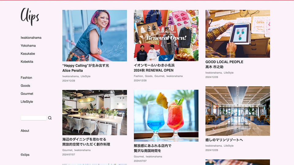 商業施設・観光施設の店舗・商品・サービスなどの最新情報に加え、その地域ならではの魅力あふれる情報をフィーチャーする情報マガジン「Clips」。